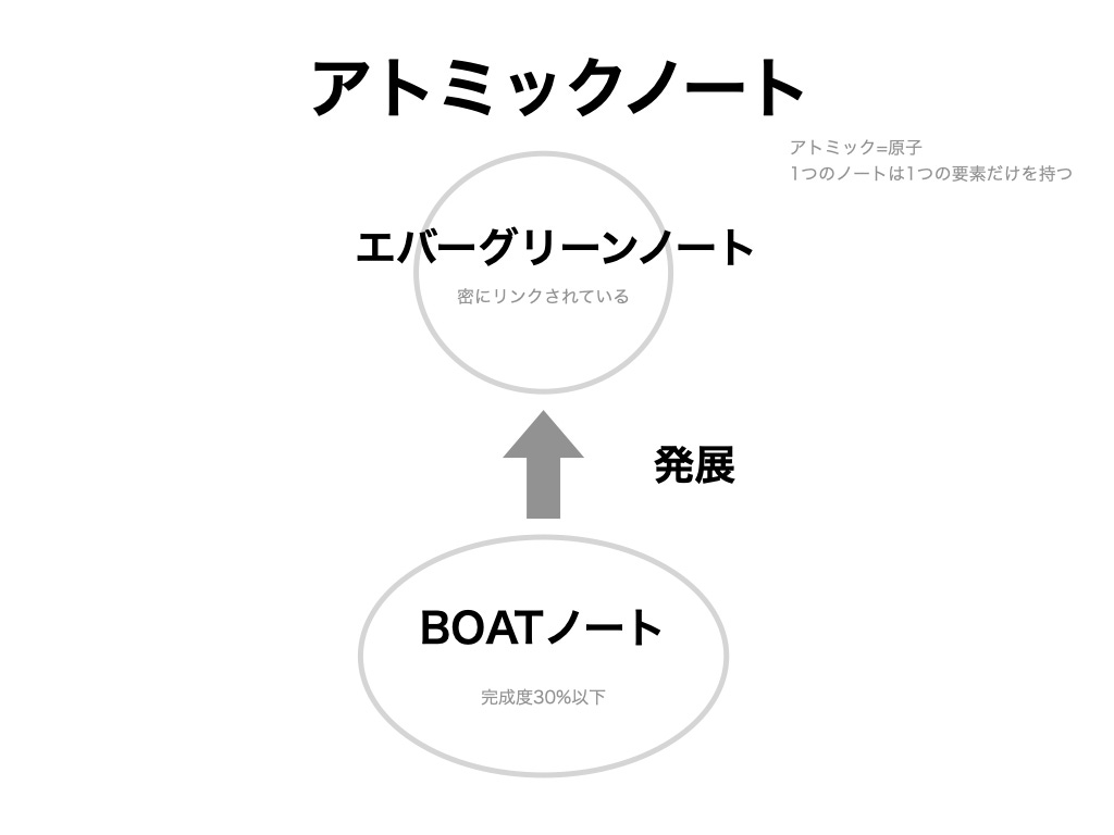 エバーグリーンノートというのはこの概念を発達させて、そこにさらに「他のノートと密接にリンクしている」だとか「APIのようなタイトルをつける」というような条件を付与することで、ノートをより再利用しやすいようにしよう、と工夫されたもの。