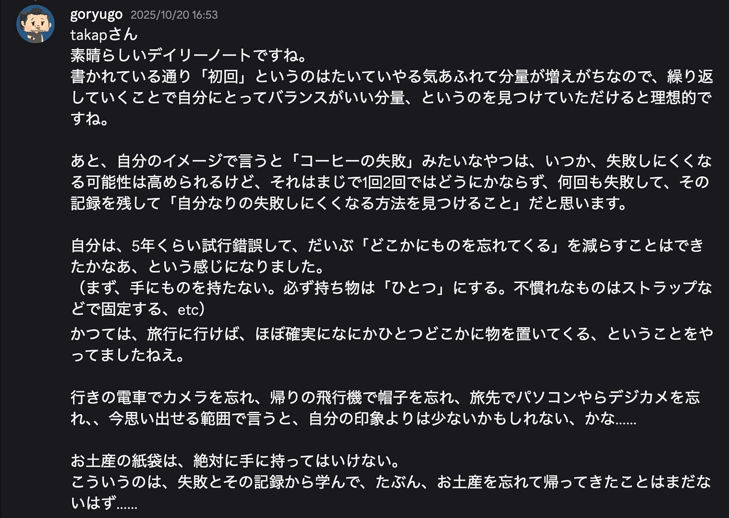 そして、そうやって間違えてもいいということをきちんとここで伝えておけば、今後もごりゅごがなにか間違えたり失敗したりしても、助けてくれたり、暖かい目で見守ってくれる人も増えるはずである。