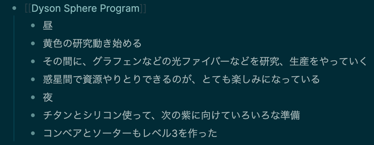 デイリーページでは以下のように記述(ツリーの下にぶら下げる)ことで、自分がまとめたいと思っている情報をまるで一つのノートかのようにまとめて表示することができるようになる。