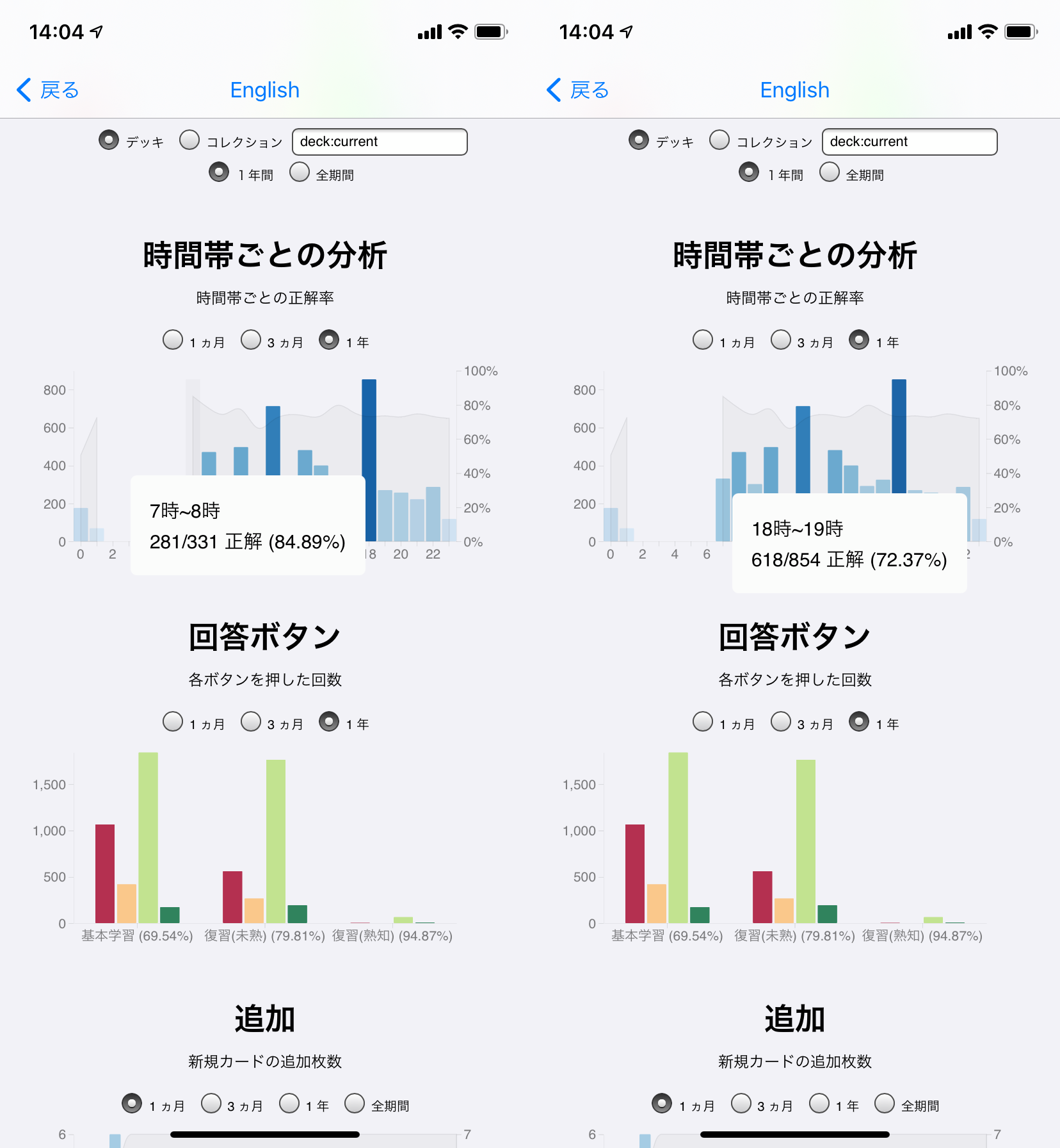 この辺りの数字が見える、というのもAnkiの面白いところ。そして、一般的に言われそうな「朝は頭の働きがいい」というのは自分の場合にもある程度当てはまる、ということがわかりました。