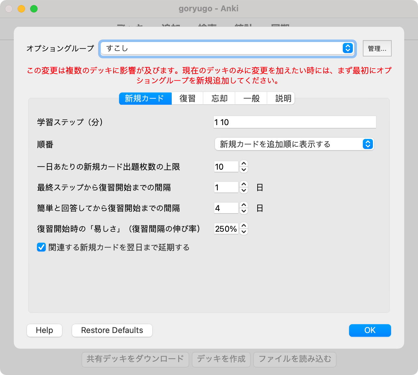 これはちょっと辛いので「新しい復習間隔」というのは40%、という設定にしています。(間違えると前回の復習感覚の40%の期間で復習)