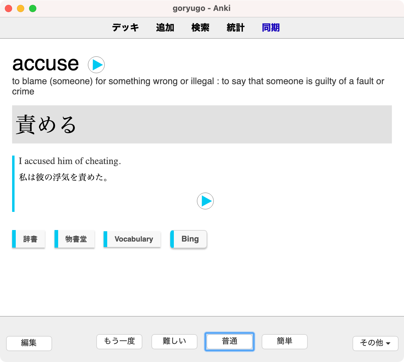 で、私はこのAnkiデッキのテンプレートを変更し、辞書へのリンクや読み上げ機能を追加しました。