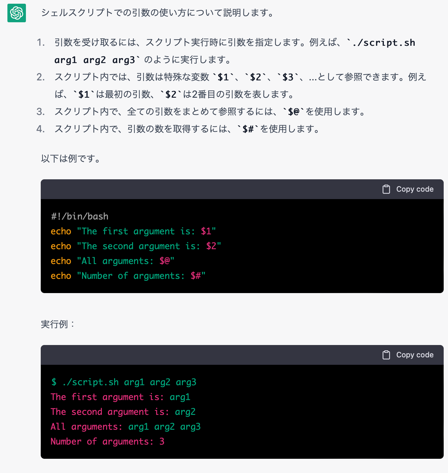 他によくあるパターンで有名なのが「コンピュータのプログラムを書いてもらう」というタイプのもの。試しにChatGPTに「シェルスクリプトでの引数の使い方を教えて」と聞いてみたら、必要十分な、まさに自分が欲しいちょうどいい答えが返ってきました。