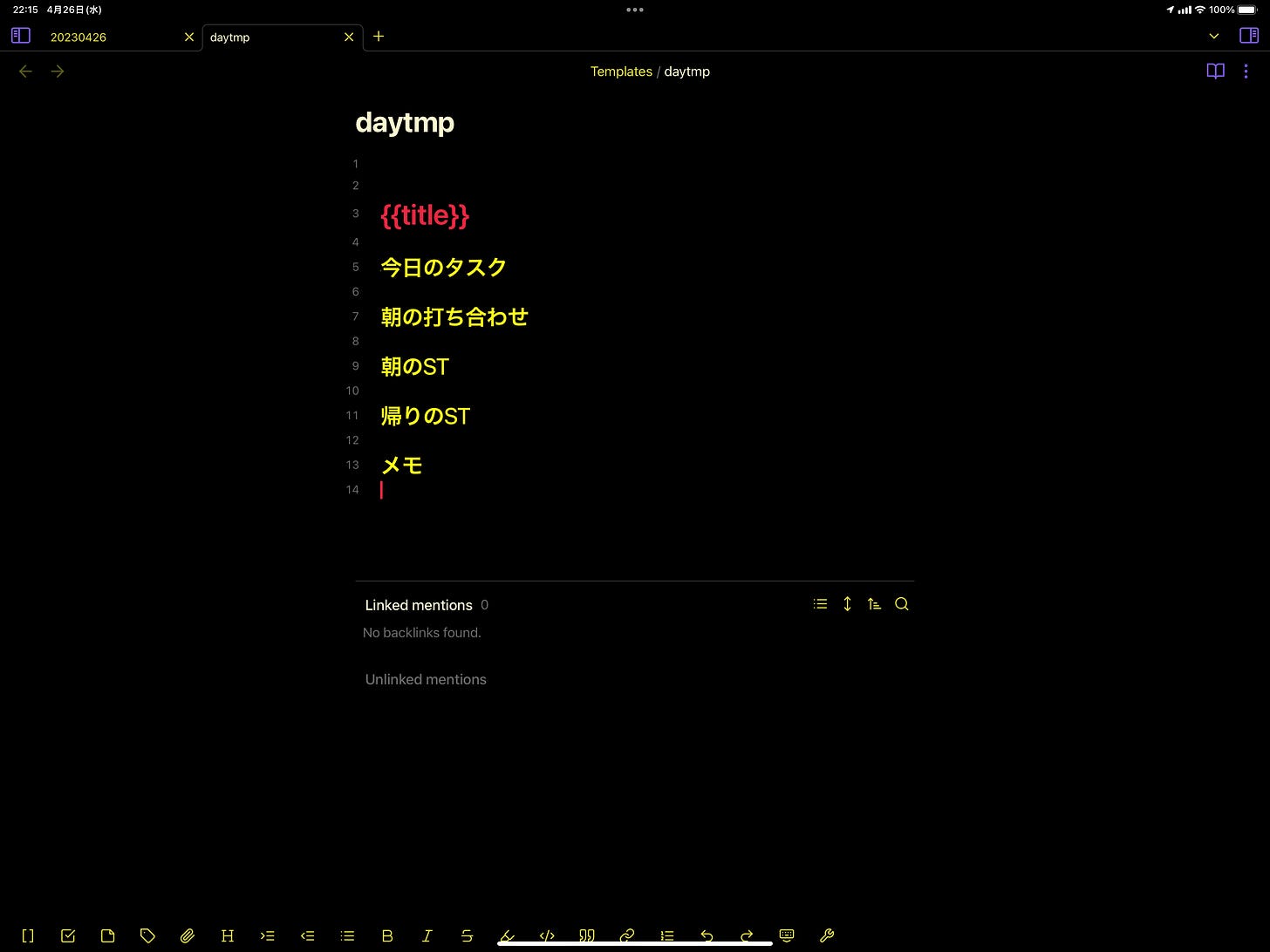 ObsidianのCore PluginにあるTemplatesを使って、デイリーノートのテンプレートに指定しているファイルです。