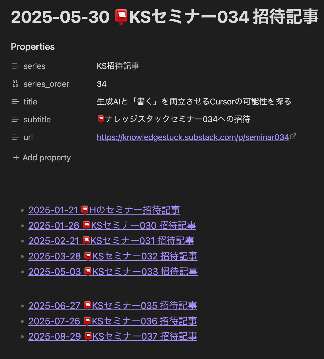 これ、定型文ひとつと、基本ルールを覚えれば、あとは勝手にいい感じに関連ノートがずらっと並んでくれます。この仕組み自体は2年前くらいから使っていたんですが、ようやくちょっとだけ「スマートな仕組み」として安定してきました。