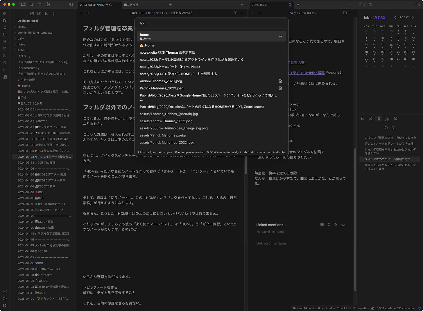 フォルダ(サイドバー)からノートを開けないとなると、わりとなにもかも「使い方」を考え直さなければなりません。自分自身がよく使うファイルをどうやったらすぐに開けるようになるか、じっくり考えなければなりません。