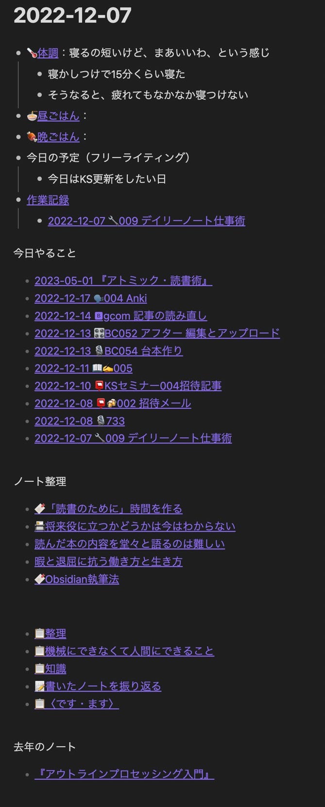 Dataviewの工夫の他、いろいろと「これがいい」というのが見つけられるようになってきたので、いわゆう「デイリーノート仕事術」として簡単に紹介したいと思います。
