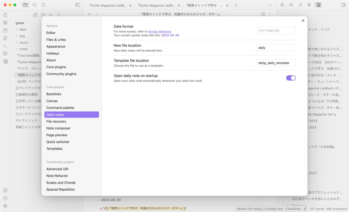 デイリーノートは、テンプレートルを作って、保管場所を「daily」に設定