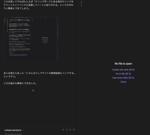 このくらい簡単なら、ある程度丁寧に「ちゃんとリンクを貼る」ことができる。こうやってやる気になれるというのも、templaterで「効率化」ができたからこそ獲得できるやる気なのです。