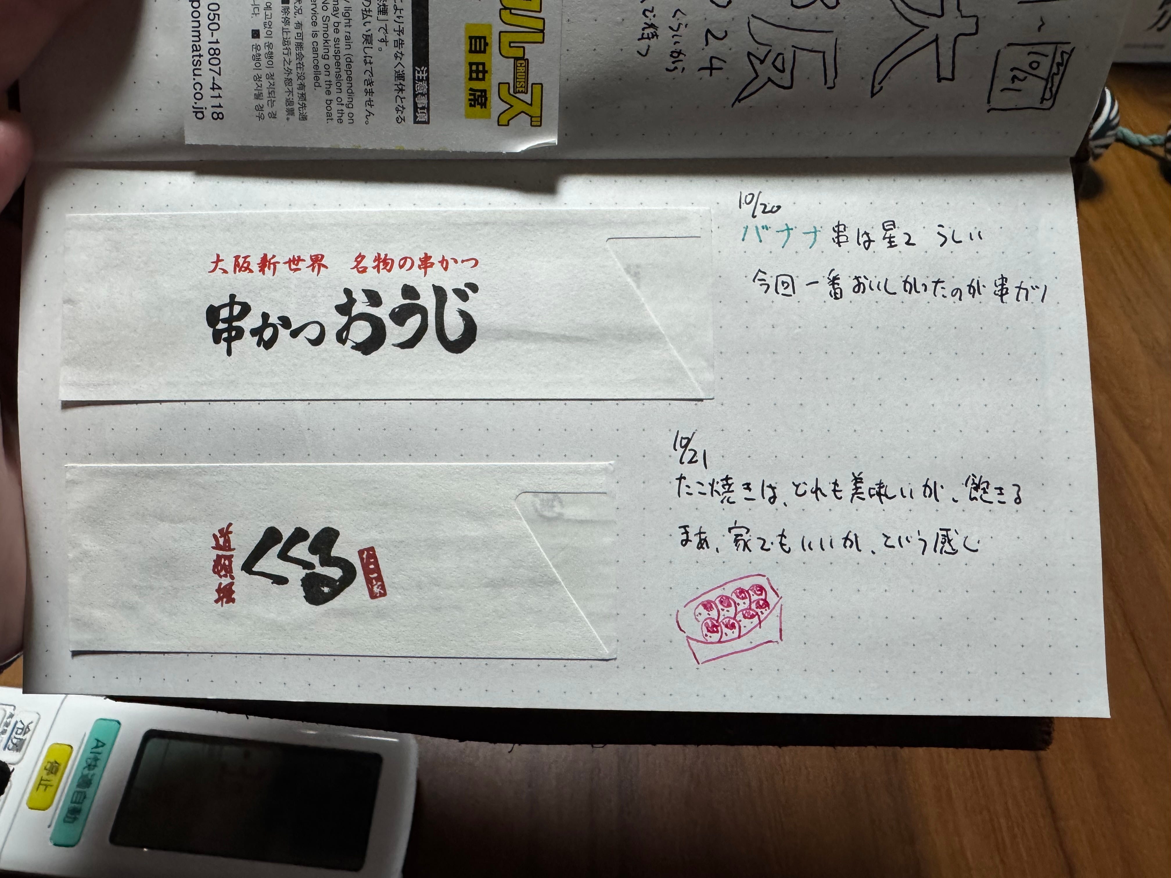 1ページに2つ貼ると、だいたいどんな箸袋もぴったりきれいに収まる。ちょっとだけできる余白に日付や感想を書いてもいいし、逆になにも書いてなくても特に気にならないちょうどよさ。綺麗に収まる。