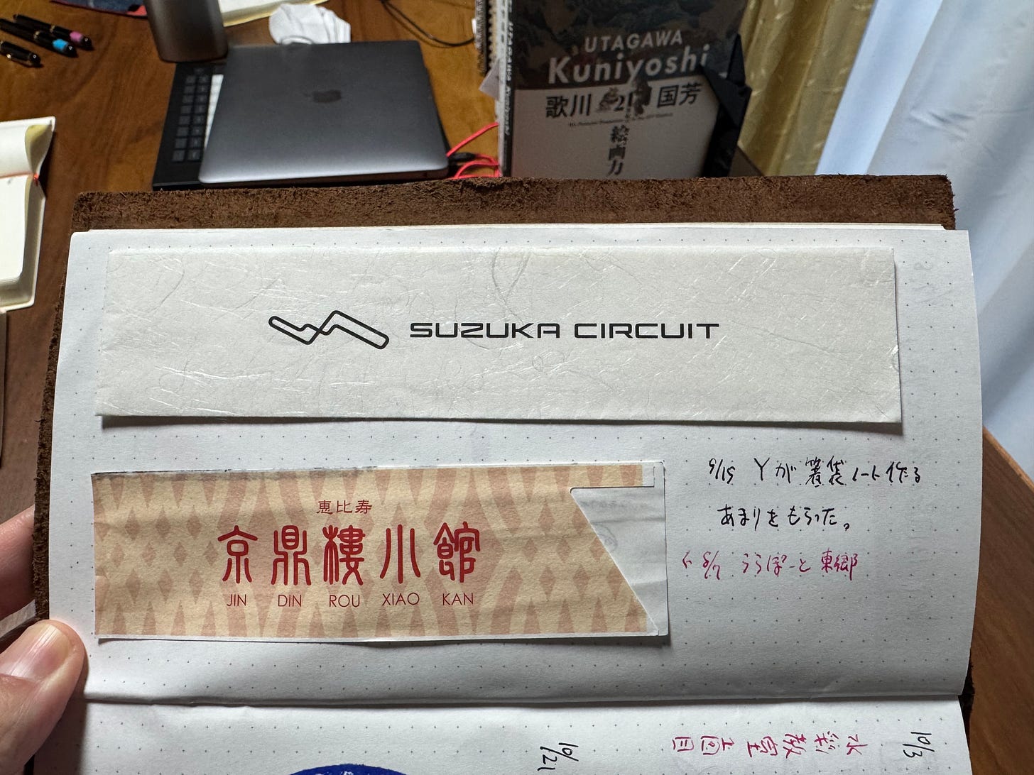 たまたま泊まったホテルのレストラン。そこにあった箸袋のデザイン性が非常に高く、息子をノート仲間に引き込むために「これ家に持って帰ってノートに貼ろうぜ」って話で盛り上がったのです。